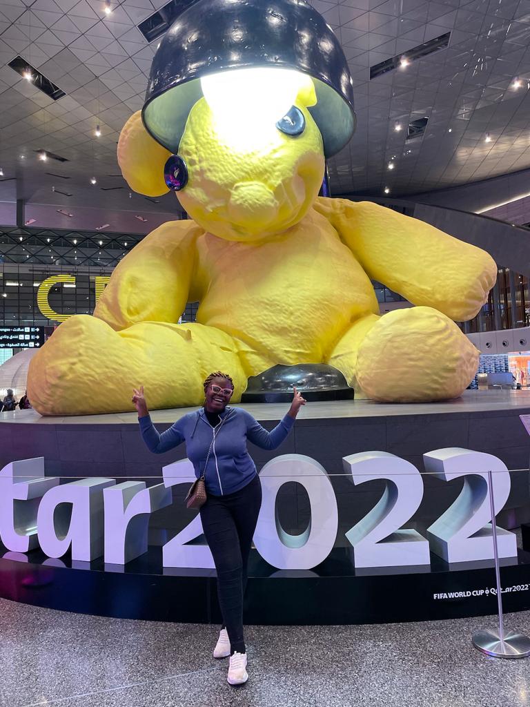 Kunmi and the famous teddy at the world’s best international airport in Doha.